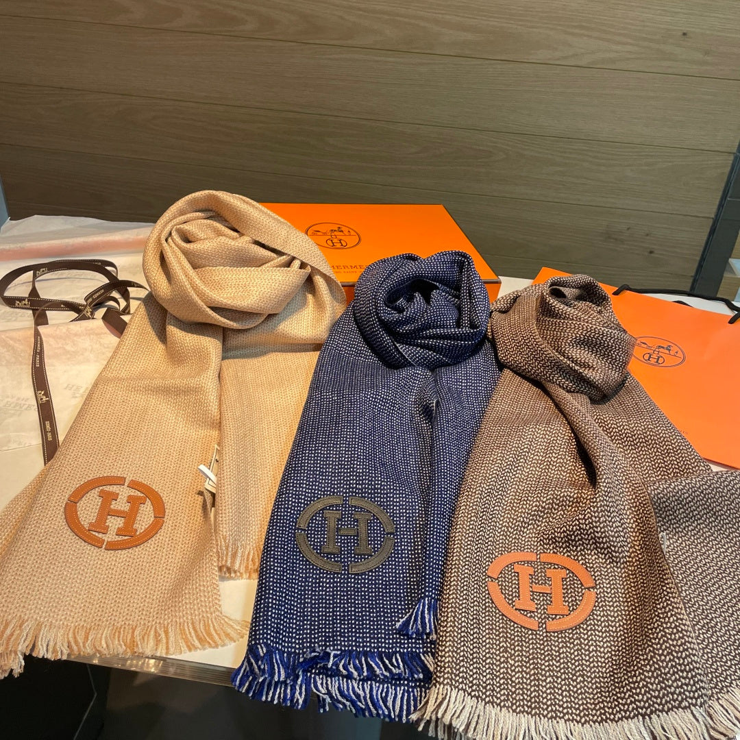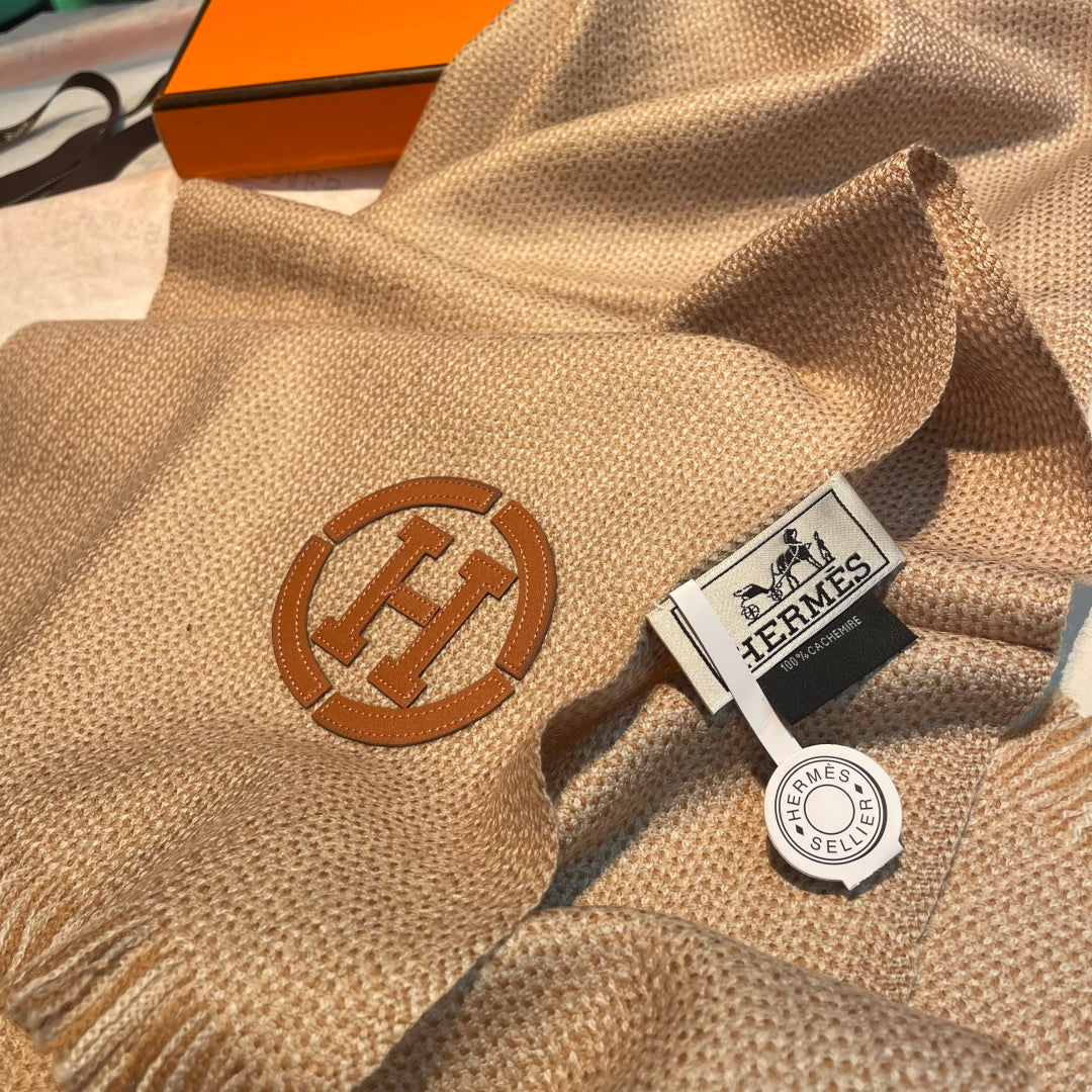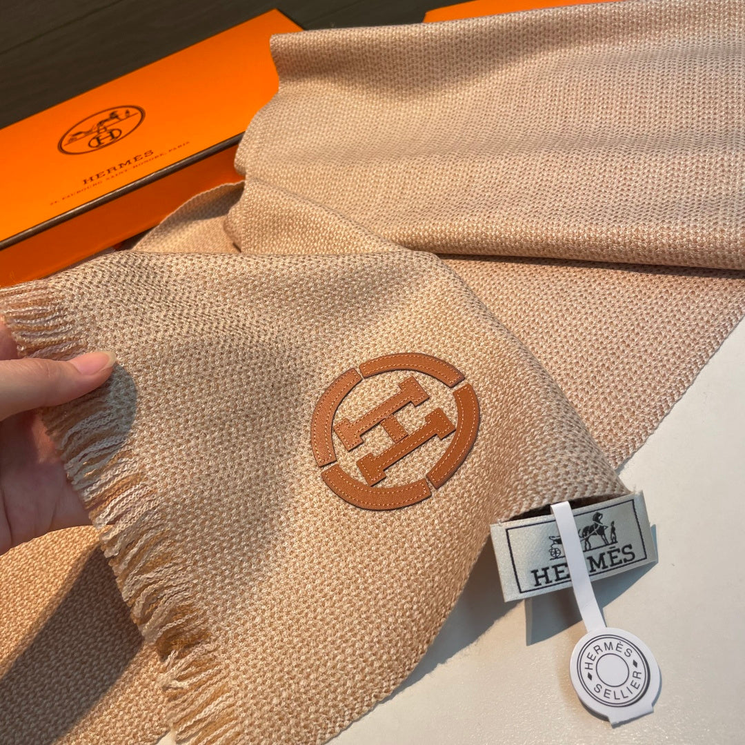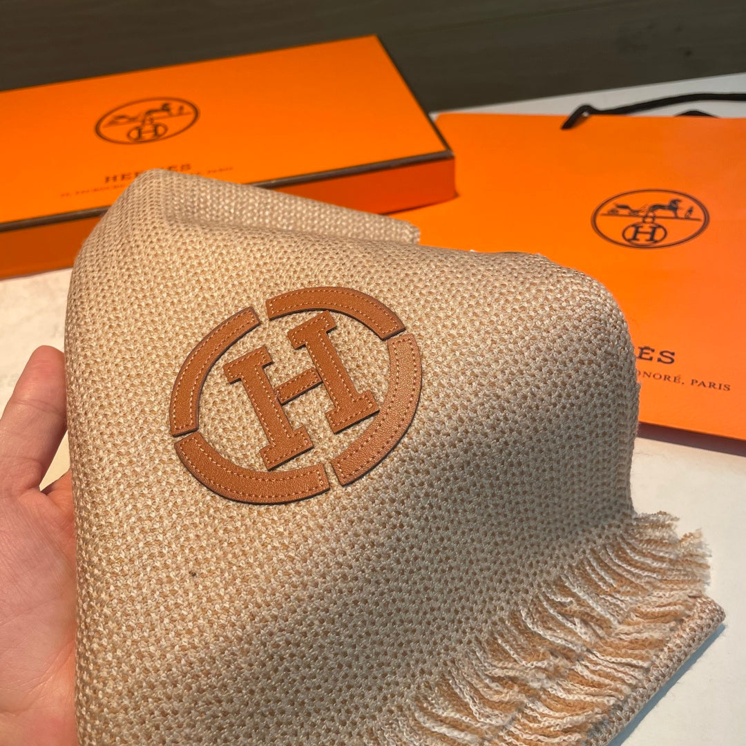 Cette écharpe en cachemire est confectionnée à la main Elle présente un subtil motif en forme de « H » obtenu par une technique de tricotage et est ornée d'un « H » brodé en cuir.